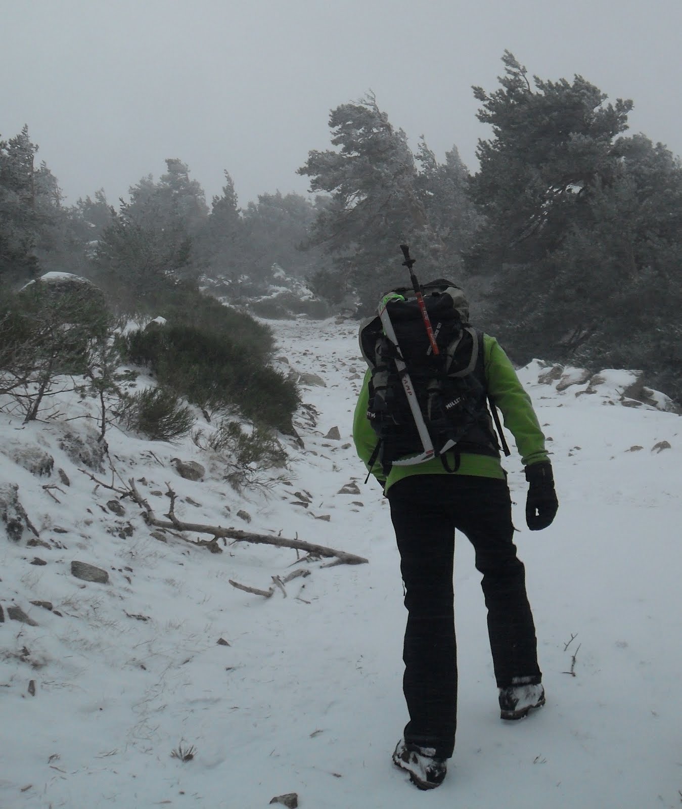 Aún sabiendo que estaban anunciadas fuertes rachas de viento en lo alto de la sierra, habíamos decidido hacer un entrenamiento durete, para ver que tal se anda por el monte a doce bajo cero con un viento a 80km o 100k/hora atizándote en el careto. El parte de montaña describe lo de esta mañana como: “Circulación ciclónica oeste-noroeste fuerte. Una vaguada extremadamente fría estará ubicado en la Sierra de Guadarrama hasta el domingo. Se espera otra irrupción el miércoles.” A mi me da que se ha quedado hasta el domingo por la tarde